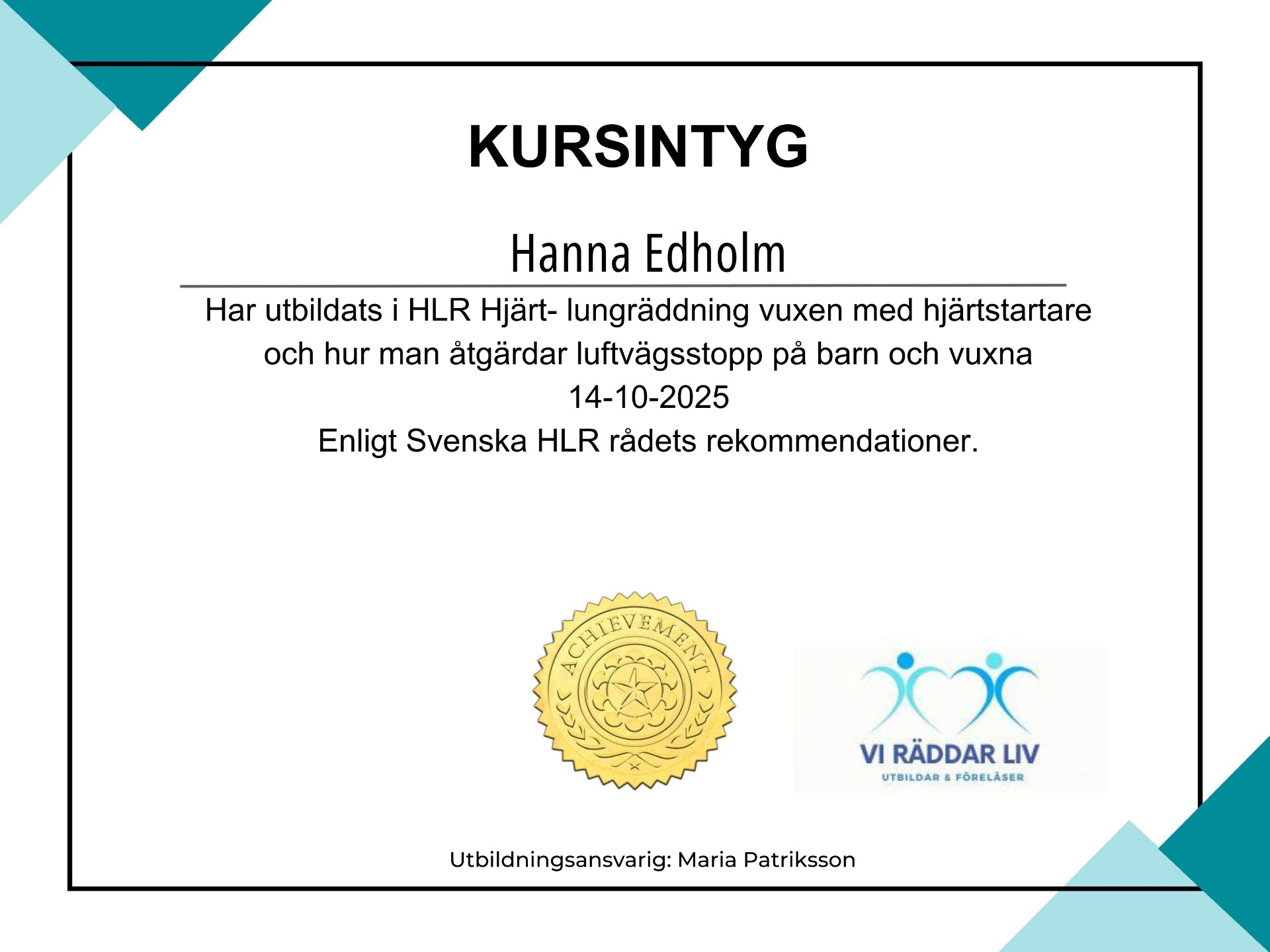 Training in Cardiopulmonary resuscitation (CPR) for adults and children (2025), through SISU and Vi Räddar Liv.