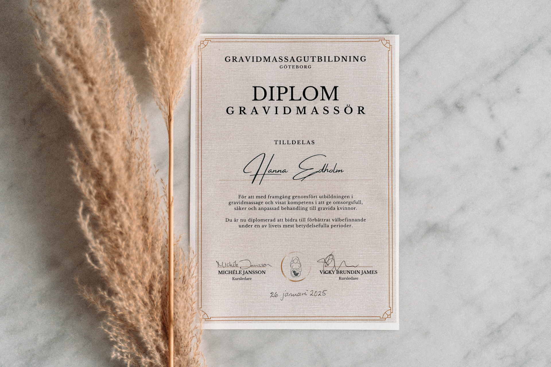 Certified massage therapist for pregnancy and postpartum through Gravidmassageutbildning Göteborg (2025), led by Michéle Jansson and Vicky Brundin James.